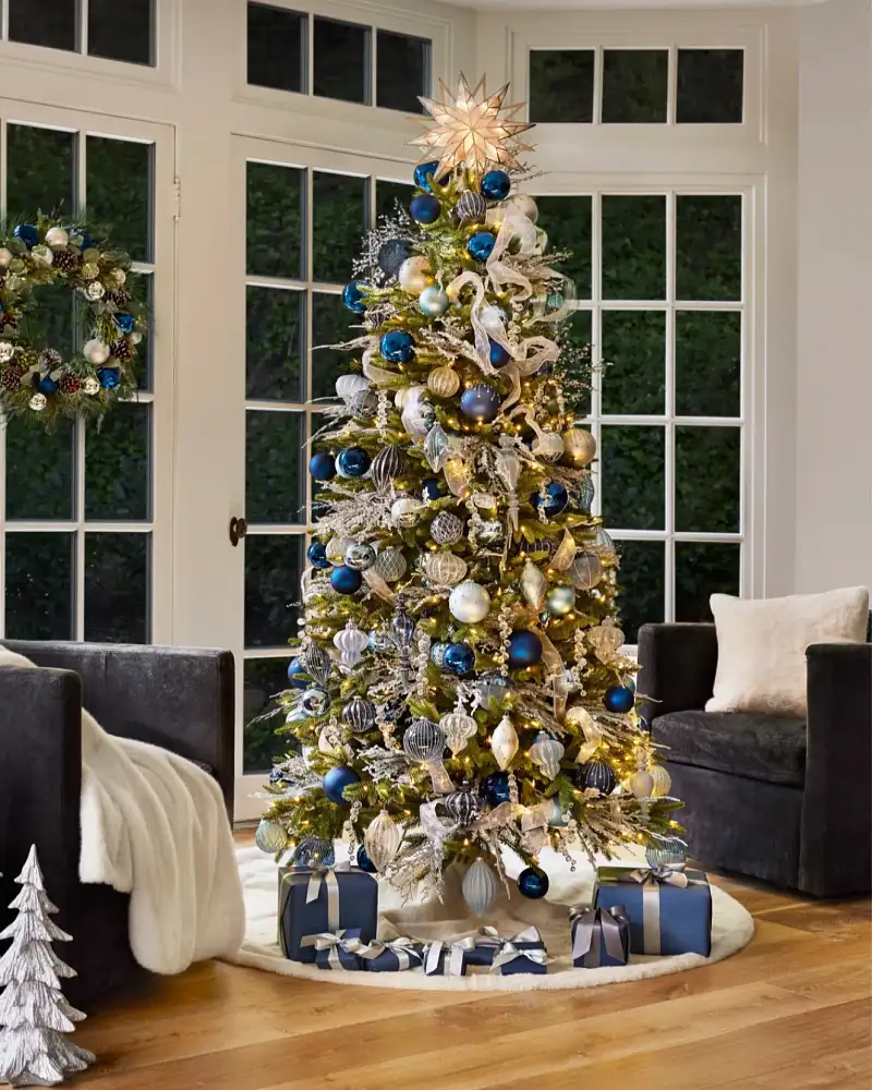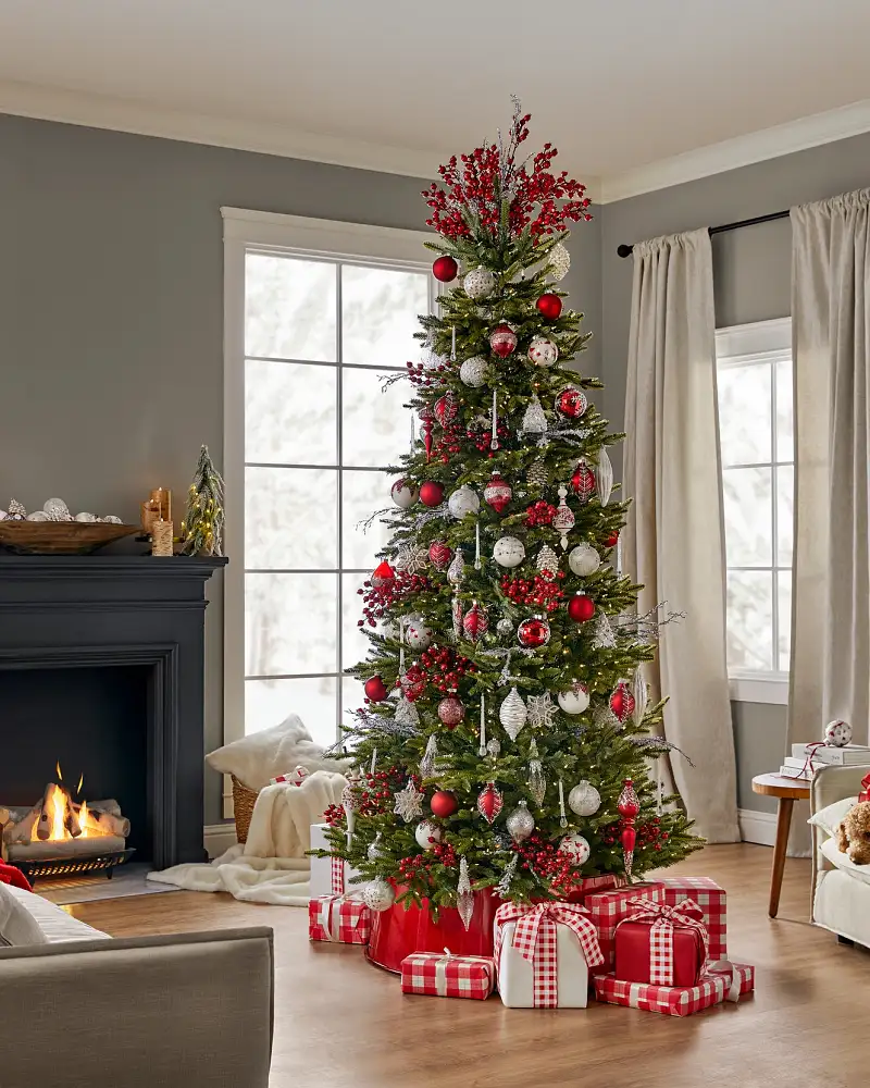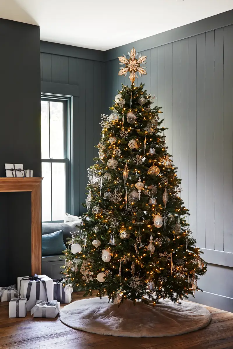 Wählen Sie einen Baum, der 15 bis 30 cm niedriger ist als Ihre Deckenhöhe, damit noch Platz für die Baumspitze ist. Weitere Informationen finden Sie in der Größenübersicht bei den Spezifikationen auf der jeweiligen Produktseite.